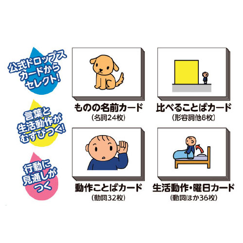 ●内容/ものの名前カード:24枚、比べることばカード:8枚、動作ことばカード:32枚、生活動作・曜日カード:36枚、説明書●サイズ/W130×D40×H90㎜●材質/紙
