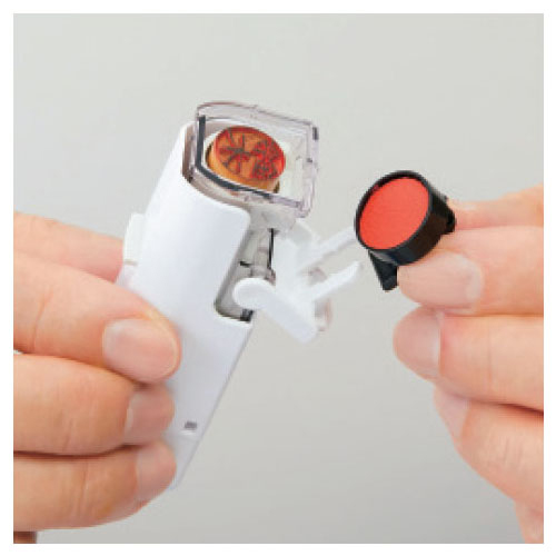 お手持ちの印鑑を差し込むだけで、朱肉を付ける手間なくワンタッチできれいになつ印出来ます。