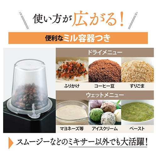 ●サイズ/W15×D15×H36.5㎝(ミル使用時:W13×D15×H27㎝)●重量/1.9㎏(ミル使用時:1.6㎏)●容量/ミキサー1.0L、ミル0.2L●電源コード長さ/1m●付属品/ヘラつきブラシ
