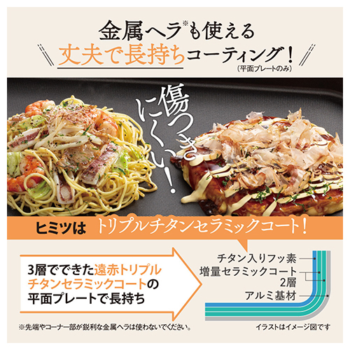 ●サイズ/W60×D37×11㎝、プレート内寸:48.4×31.8×2.6㎝●重量/5.5 ㎏ ●消費電力/1350W●最高温度/250℃(フタなし)●電源コード長さ/2.5m