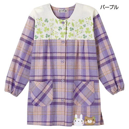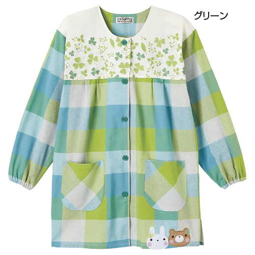 クローバーの切替がさわやか。裾にはうさぎとくまのアップリケ。