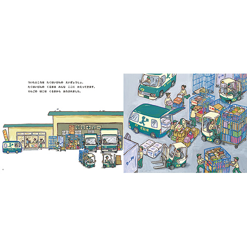 宅配便の車に乗って、おじいちゃんの畑でとれたりんごの旅がはじまります。大きなトラックに乗りかえて…。楽しい乗り物絵本。