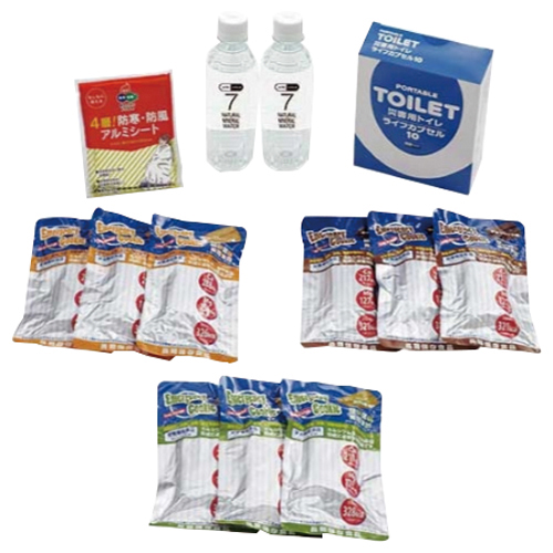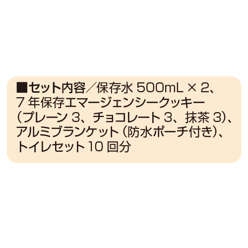 ■セット内容/保存水500mL × 2、7 年保存エマージェンシークッキー(プレーン3、チョコレート3、抹茶3)、アルミブランケット(防水ポーチ付き)、トイレセット10 回分
