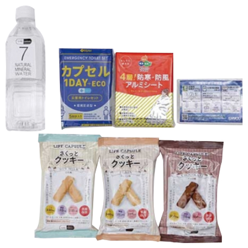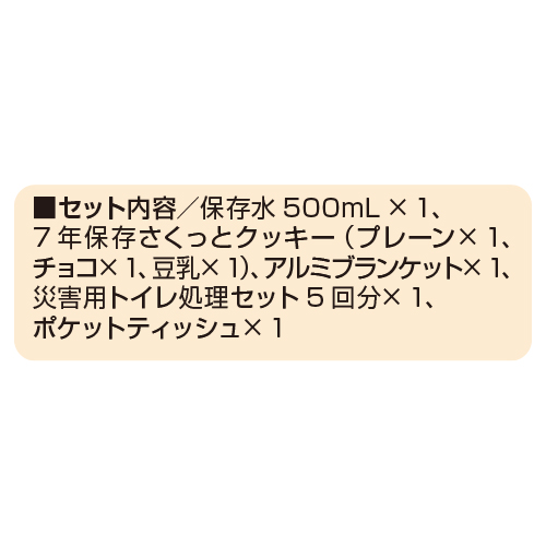 ●種別/ 1日分●保存期限/ 7年(賞味期限まで6年半以上)■セット内容/保存水500mL × 1、7 年保存さくっとクッキー(プレーン× 1、チョコ×1、豆乳×1)、アルミブランケット×1、災害用トイレ処理セット5 回分× 1、ポケットティッシュ× 1