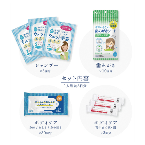 ●内容/(1)ウェット手袋2枚入×3袋(2)歯みがきシート10枚入×1袋(3)みんなのからだふき30枚×1袋(4)コットンボディタオル1枚入×3袋