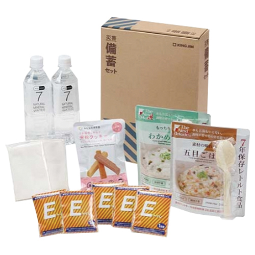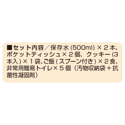 ■セット内容/保存水(500ml) × 2 本、ポケットティッシュ× 2 個、クッキー(3本入) × 1 袋、ご飯( スプーン付き) × 2 食、非常用簡易トイレ× 5 個(汚物収納袋+ 抗菌性凝固剤)