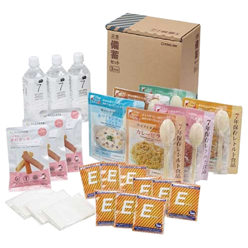 ●保存期限/ 6年(賞味期限まで5年2カ月以上)■セット内容/ご飯(スプーン付)× 6 食(わかめご飯・五目ごはん・カレーピラフ・コーンピラフ・トマトリゾット・ホワイトシチューリゾット×各1 食)、保存水(500mL)×3 本、ポケットティッシュ× 3 個、クッキー(3 本入)× 3 袋、非常用簡易トイレ(汚物収納袋+ 抗菌性凝固剤)× 9 個