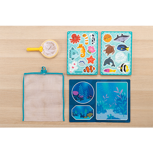 ●材質/うみのいきものブロック:EVA、すいぞくかんシート:ストーンペーパー、すくいあみ:ポリエステル・PP、お片付けあみ:ポリエステル