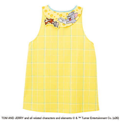 明るいイエローチェックに、アップリケ刺繍でトムとジェリーを立体的に表現。