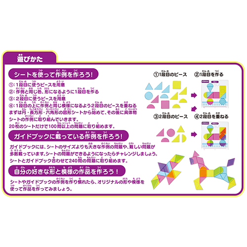 ●内容/ピース:36枚(各色6種、2セット)、シート:20枚(表裏)、ガイドブック:1部●材料/ピース:ABS、シート・ガイドブック:紙