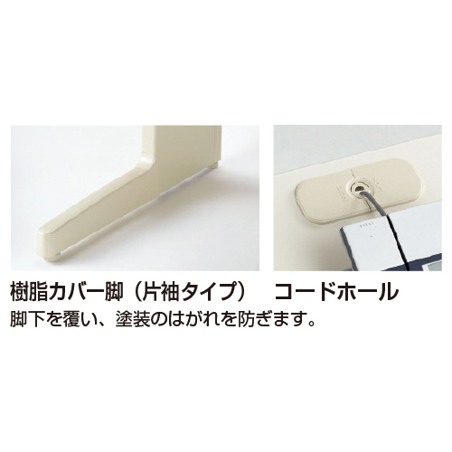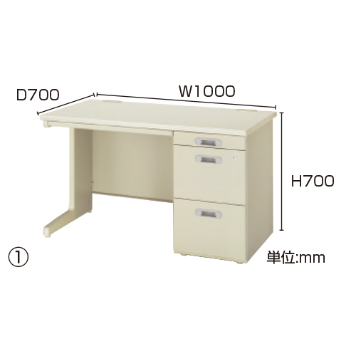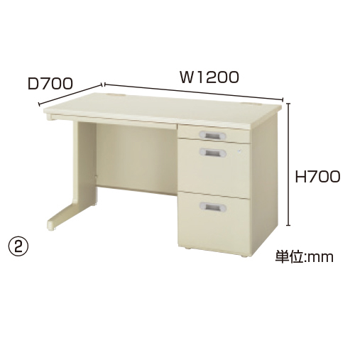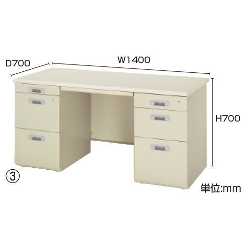 共通仕様・ 材質/スチール粉体塗装・メラミン化粧板・前面ポストフォーム加工・側面ABS樹脂エッジ30㎜厚・ 鍵/片袖デスク・両袖デスク左:引出し2段目、両袖デスク右:引出し1段目(全てオールロック錠)