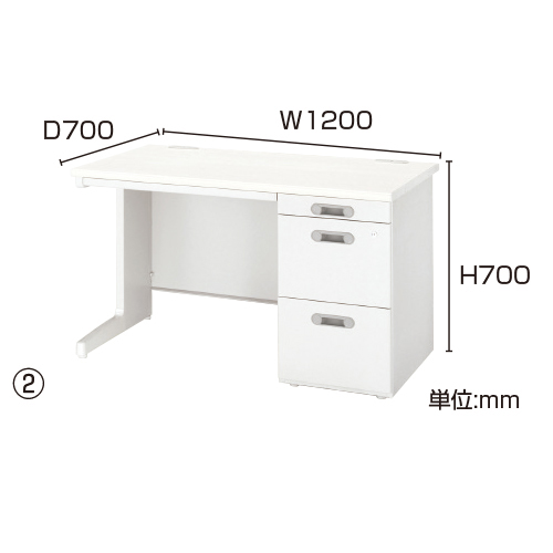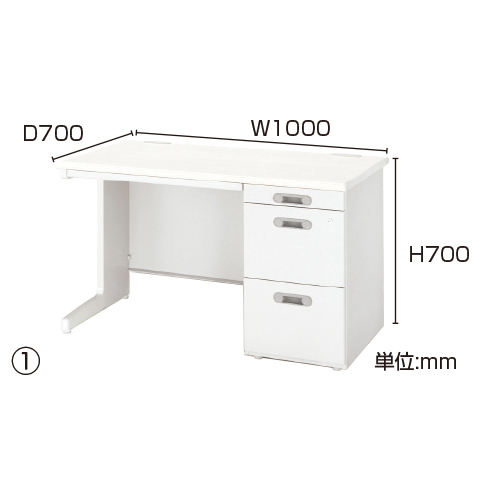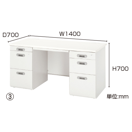 共通仕様・ 材質/スチール粉体塗装・メラミン化粧板・前面ポストフォーム加工・側面ABS樹脂エッジ30㎜厚・ 鍵/片袖デスク・両袖デスク左:引出し2段目、両袖デスク右:引出し1段目(全てオールロック錠)