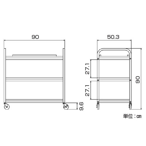 ●サイズ/W90×D50.3×H90㎝●重量/30㎏●材質/天板:ポリ化粧板、脚:2.5㎝角スチールメッキ●φ5㎝キャスター4個付